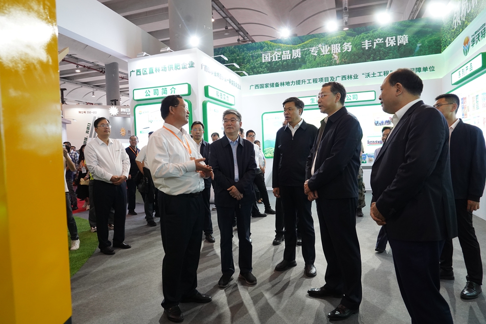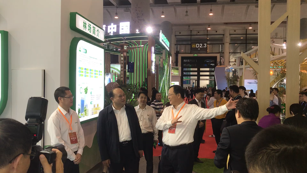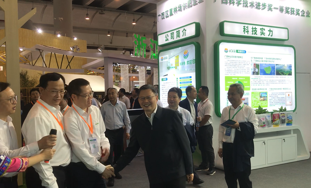 2019年11月,中国-东盟博览会林木展,时任广西壮族自治区人民政府副主席方春明(前排右一)到华沃特展馆参观指导。