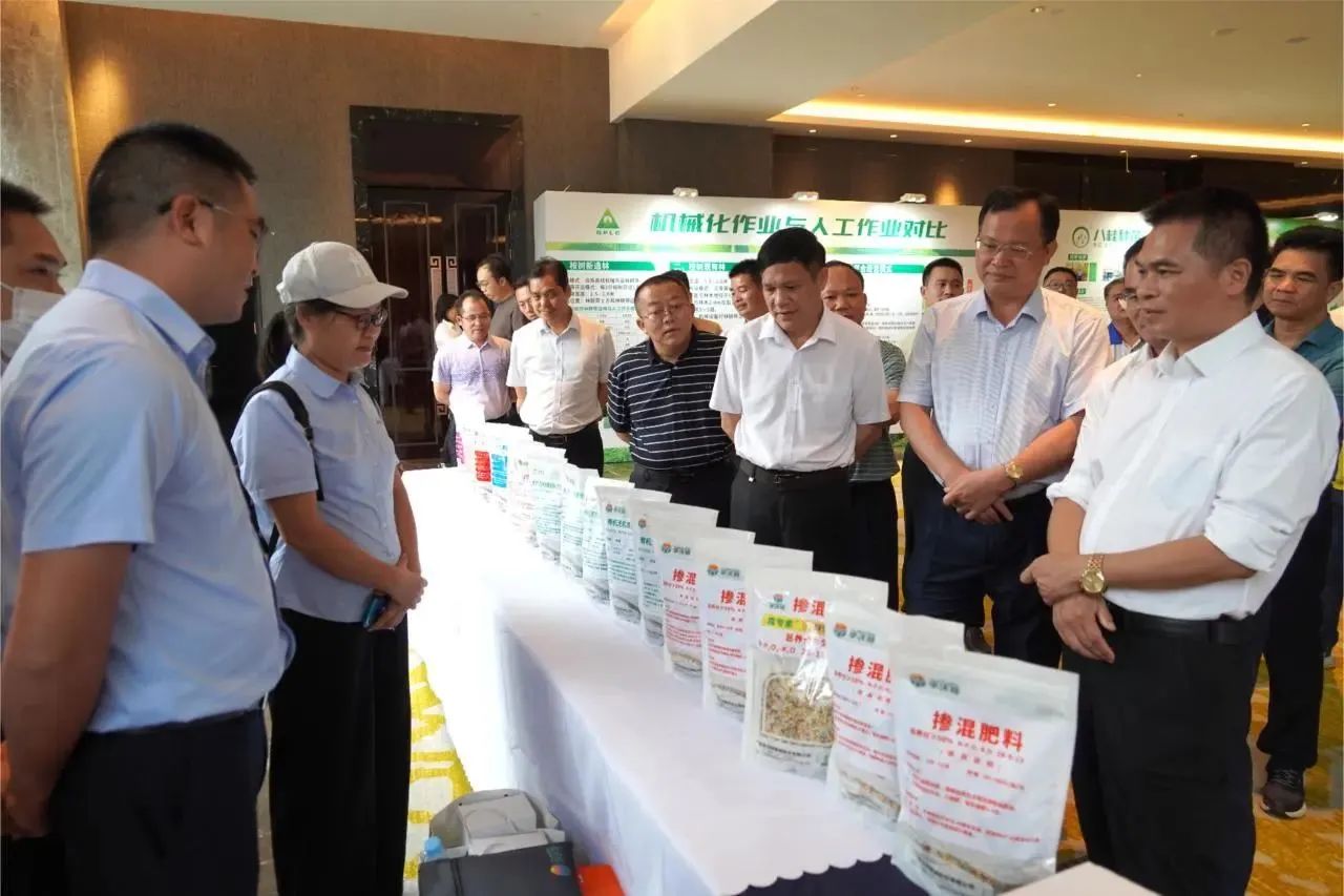 2023年9月8日,科学发展桉树推介交流会上自治区林业局副局长陆志星(右一)了解华沃特集团产品,华沃特集团董事长蒋林(右二)陪同。