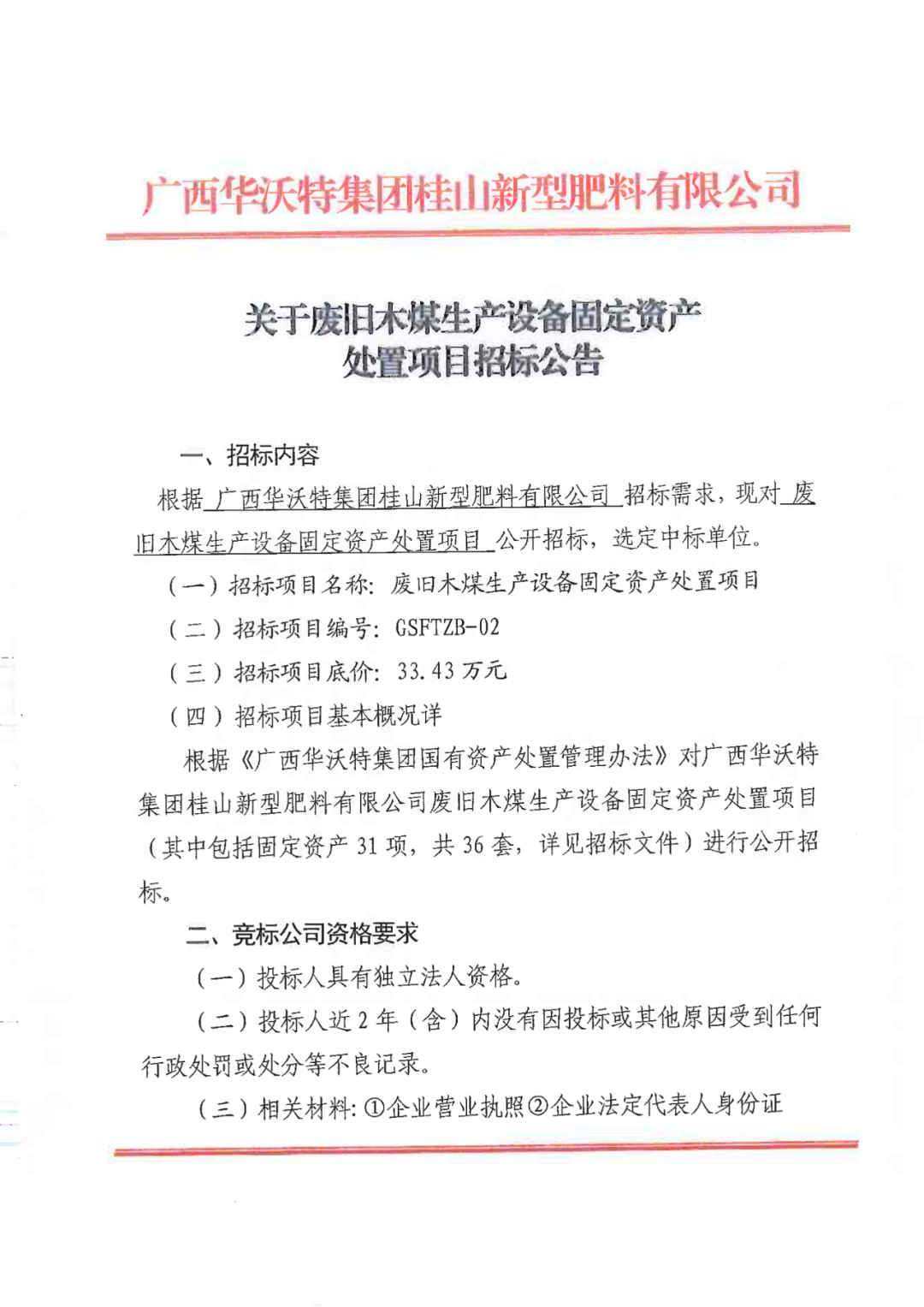 关于废旧木煤生产设备固定资产处置项目招标公告