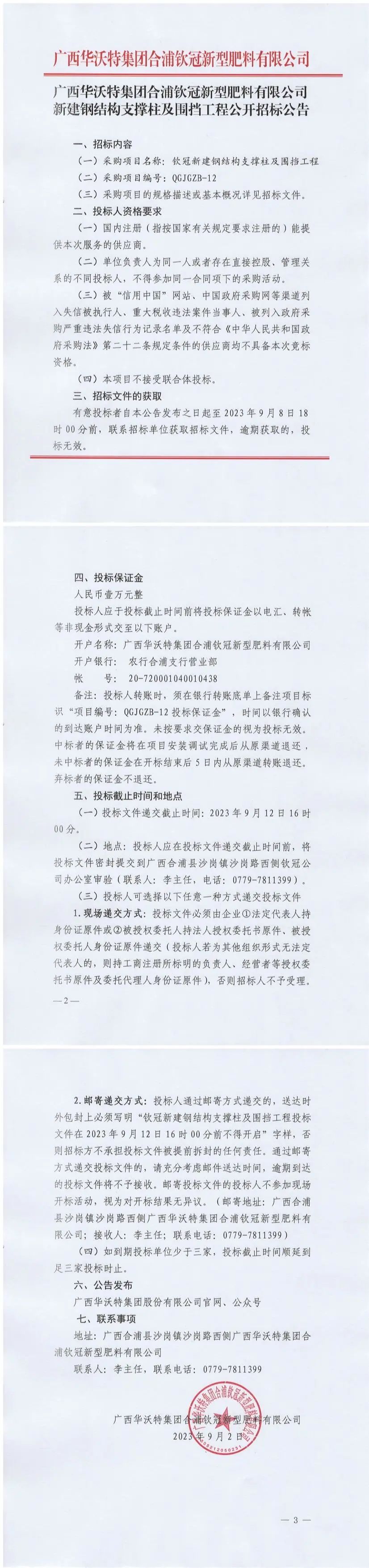 广西华沃特集团合浦钦冠新型肥料有限公司新建钢结构支撑柱及围挡工程公开招标公告