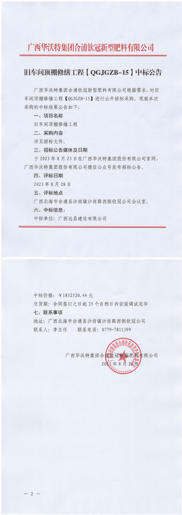 【中标公告】旧车间顶棚修缮工程[QGJGZB-15]中标公告