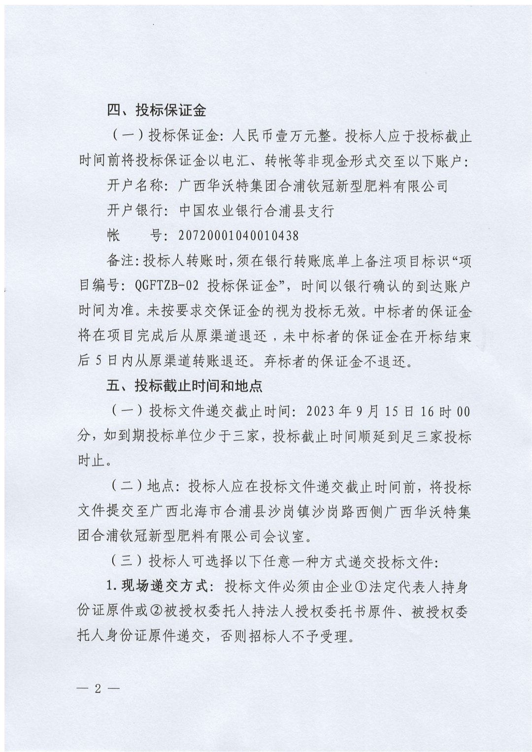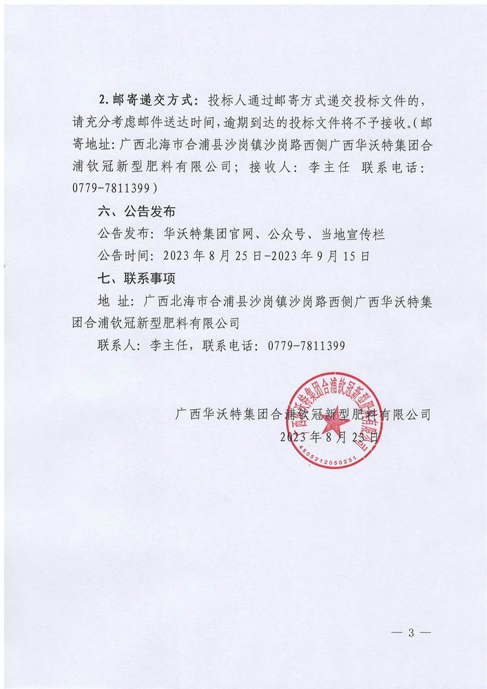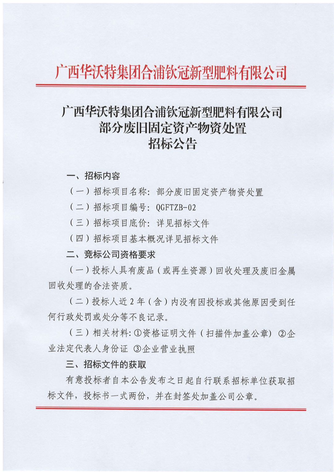 广西华沃特集团合浦钦冠新型肥料有限公司部分废旧固定资产物资处置招标公告(QGFTZB-02)