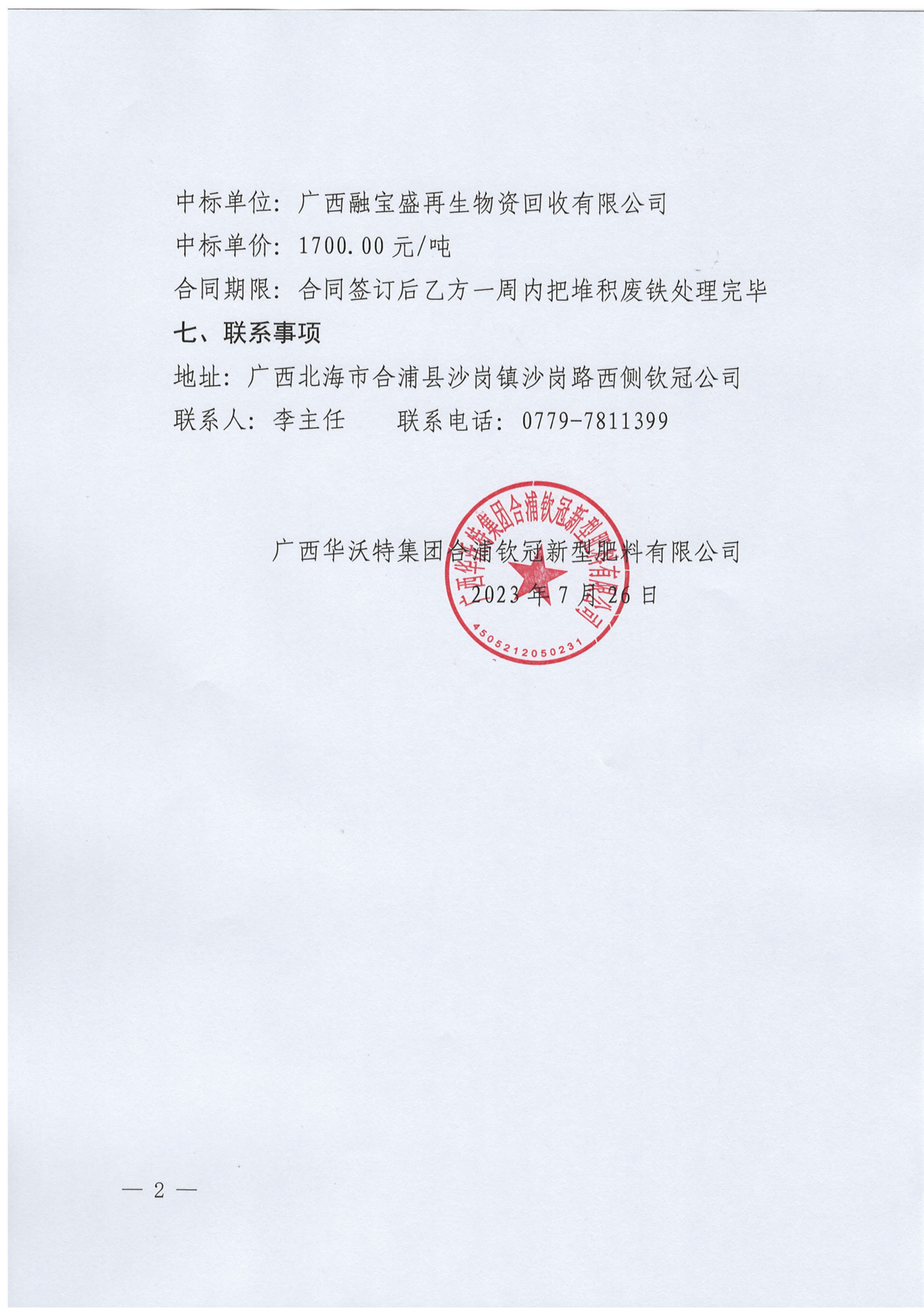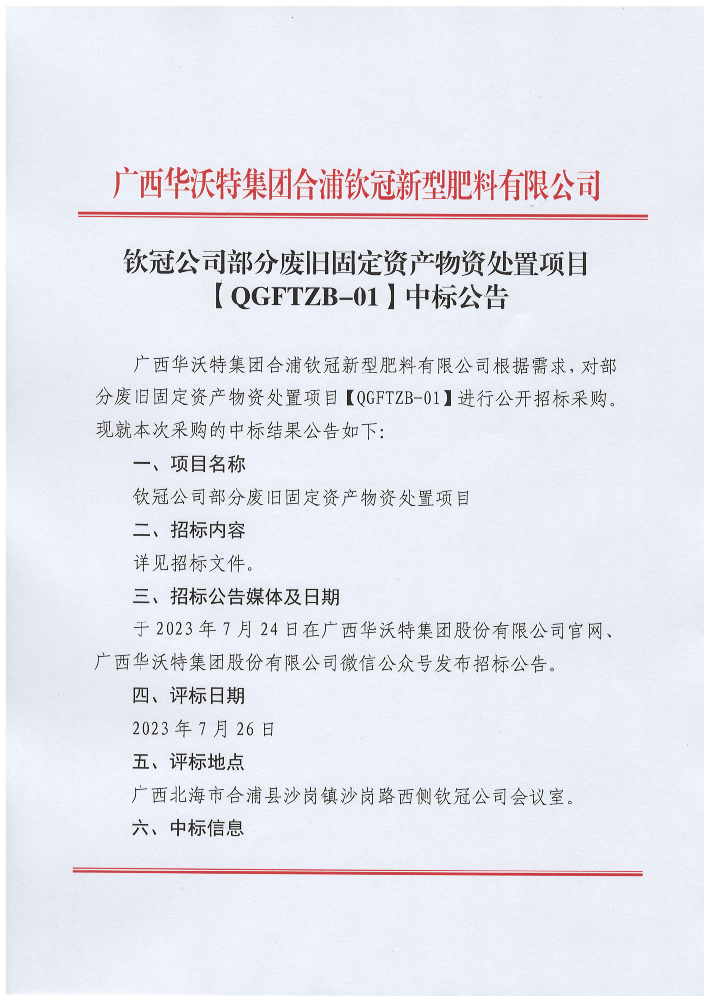 【中标公告】钦冠公司部分废旧固定资产物资处置项目【QGFTZB-01】