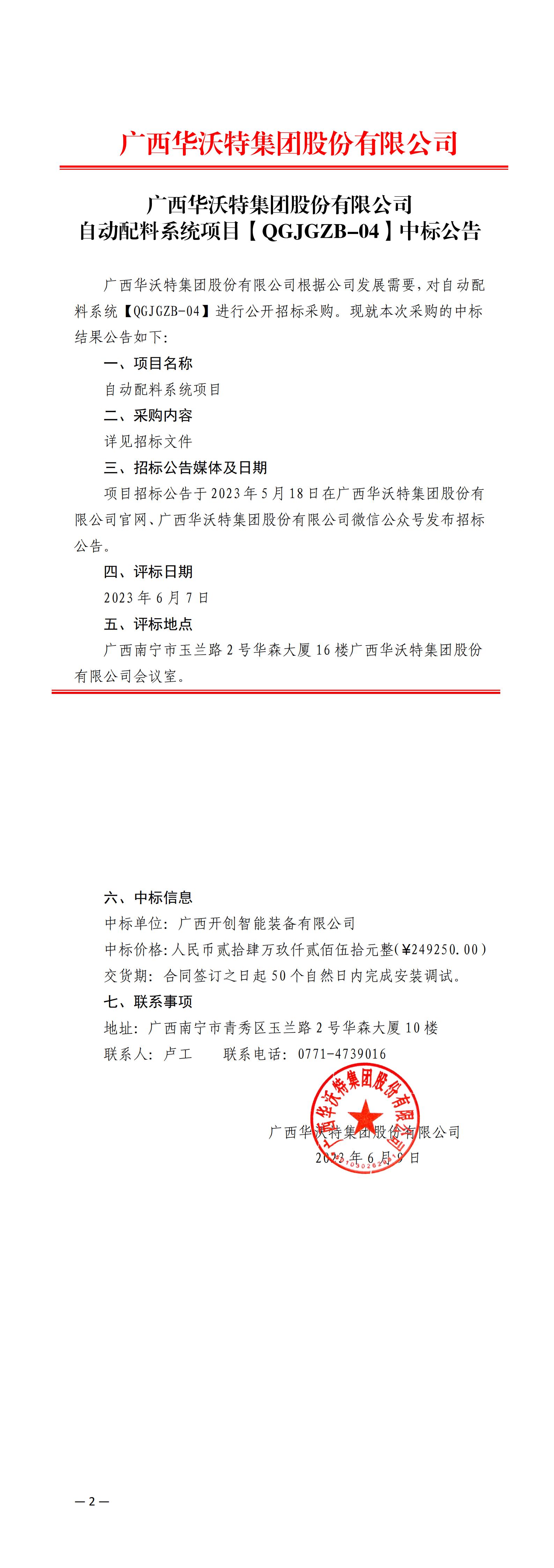 【中标公告】广西华沃特集团股份有限公司自动配料系统项目[QGJGZB-04]