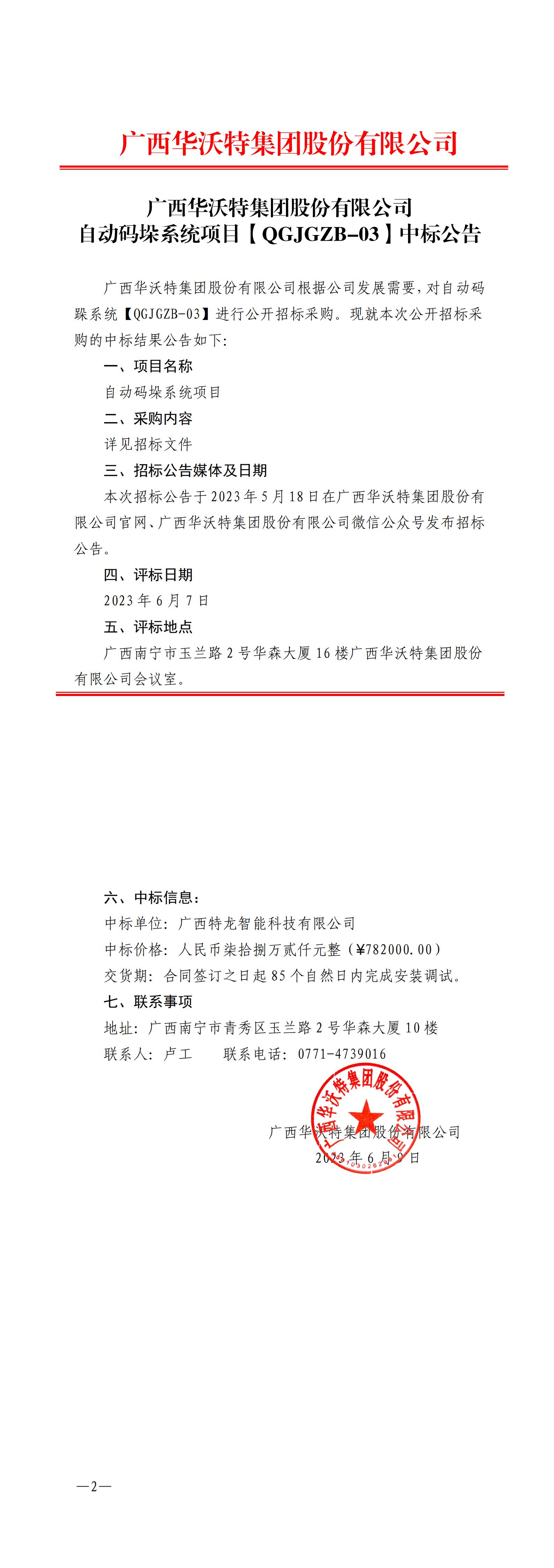 【中标公告】广西华沃特集团股份有限公司自动码垛系统项目[QGJGZB-03]