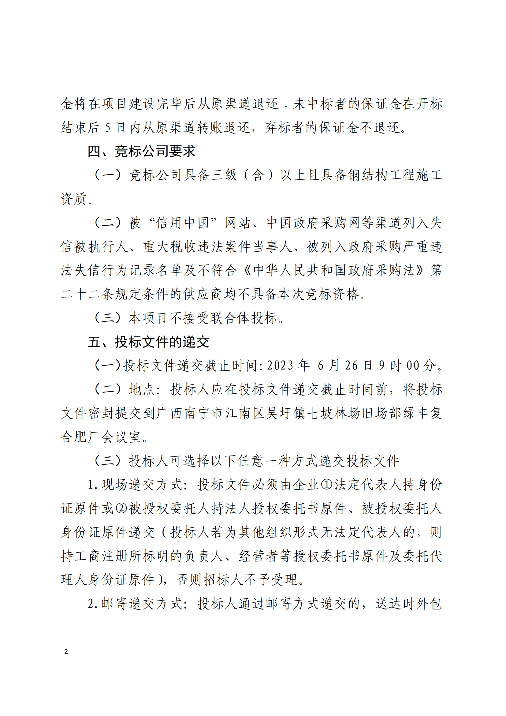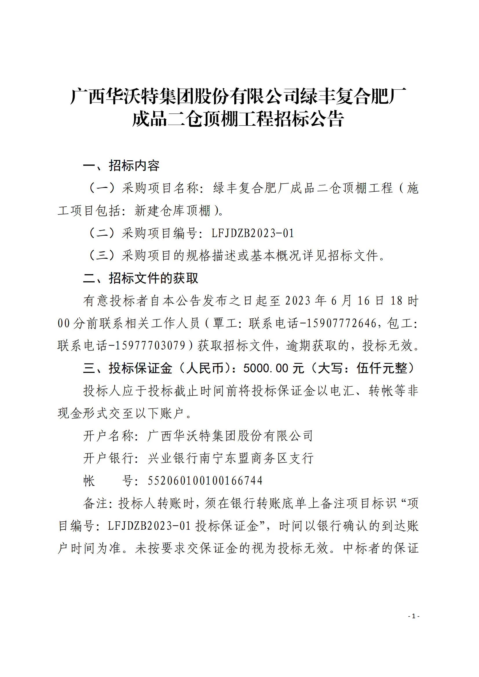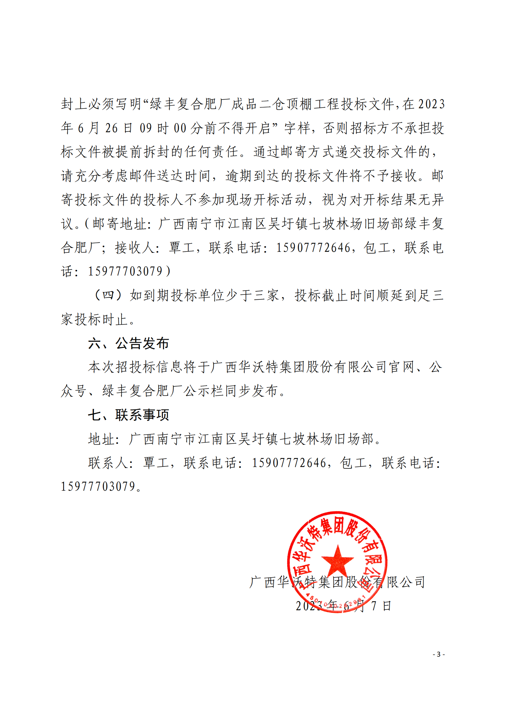 【招标公告】广西华沃特集团股份有限公司绿丰复合肥厂成品二仓顶棚工程