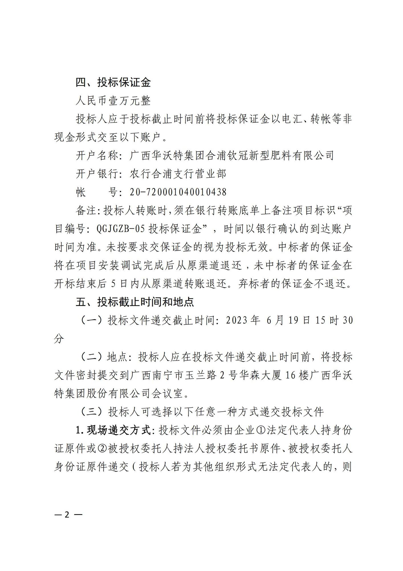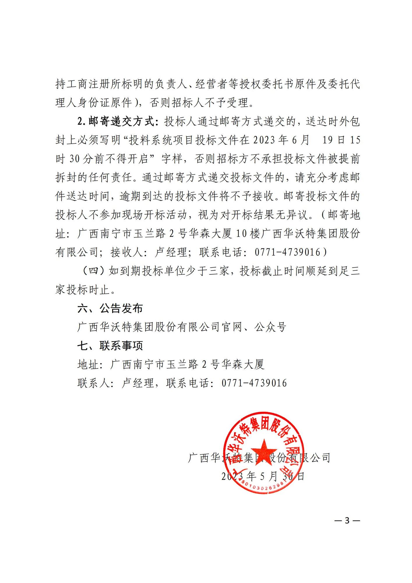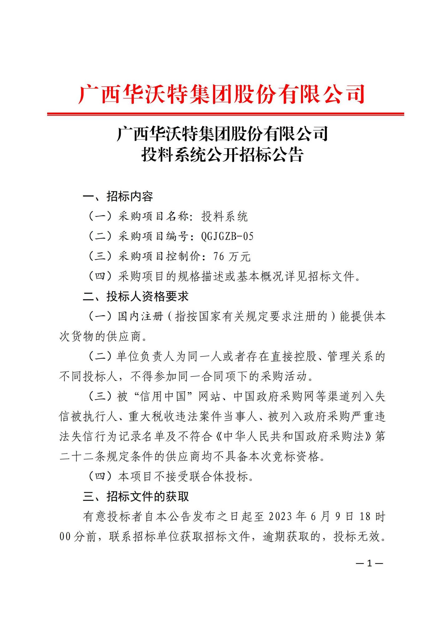 广西华沃特集团股份有限公司投料系统公开招标公告