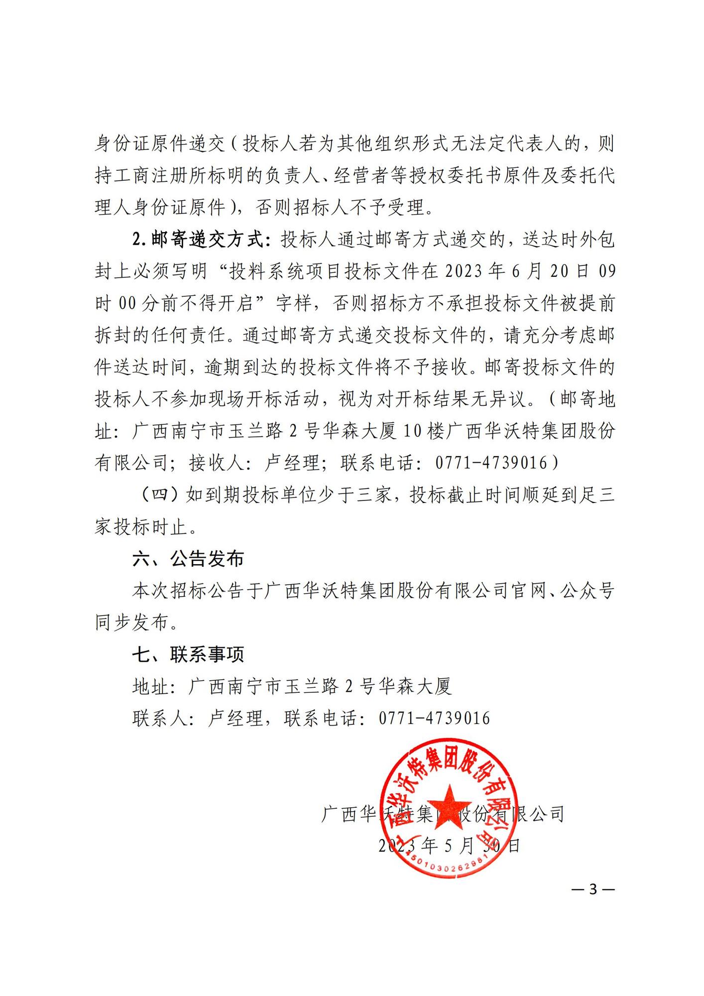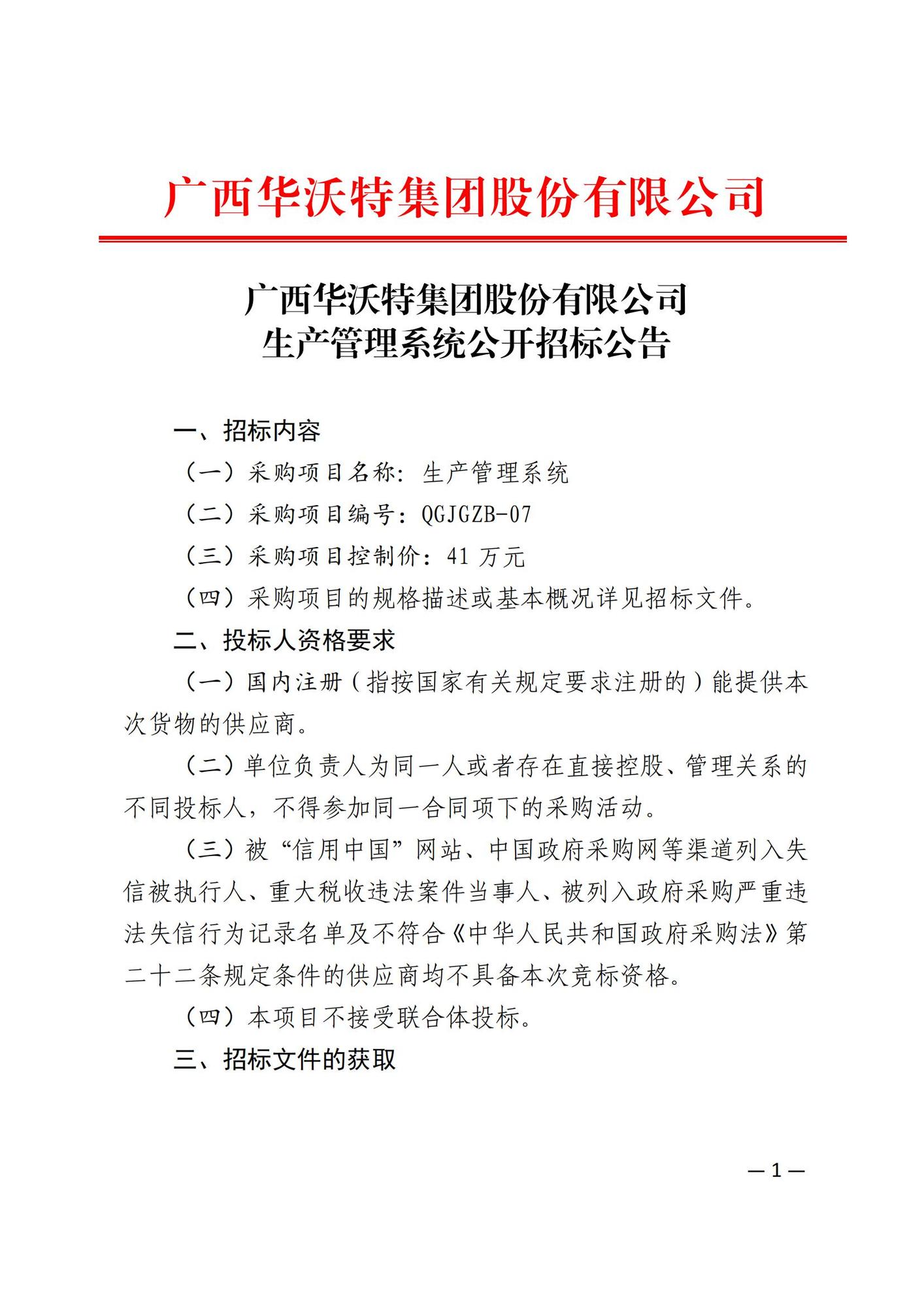 广西华沃特集团股份有限公司生产管理系统公开招标公告