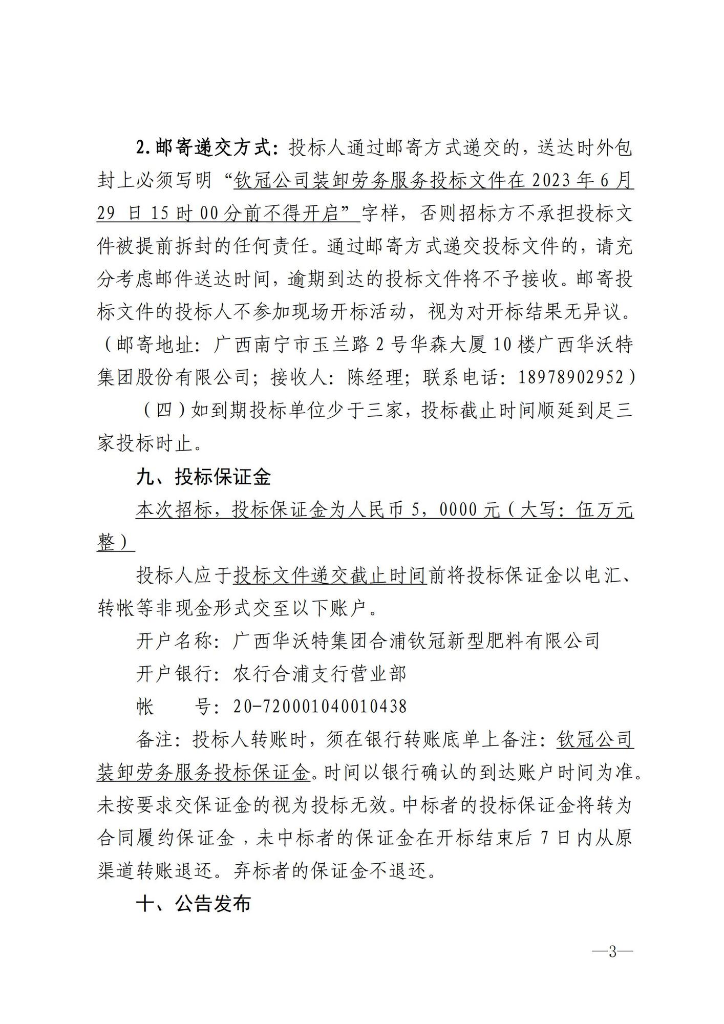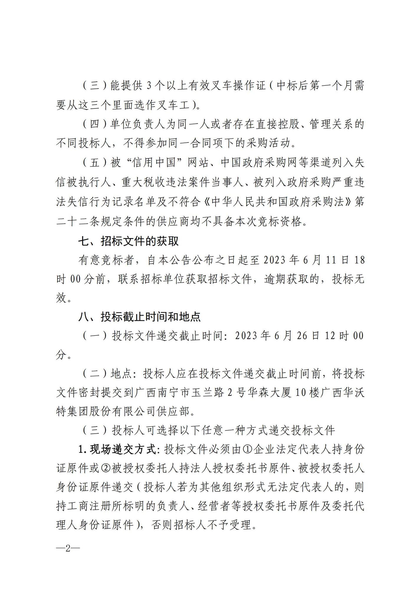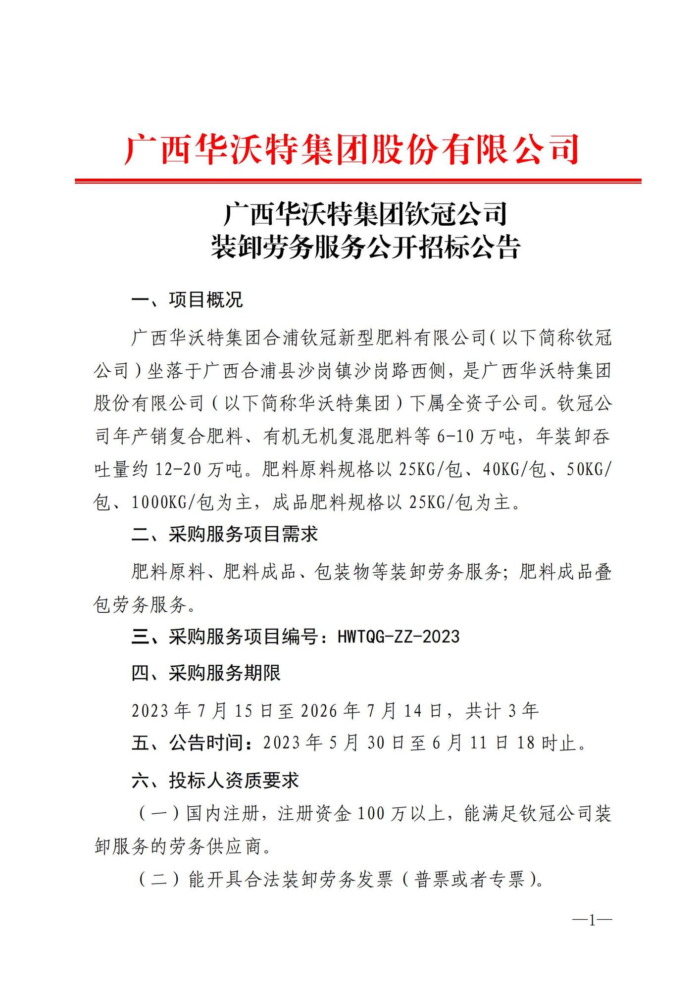 广西华沃特集团钦冠生产基地装卸劳务公开招标公告