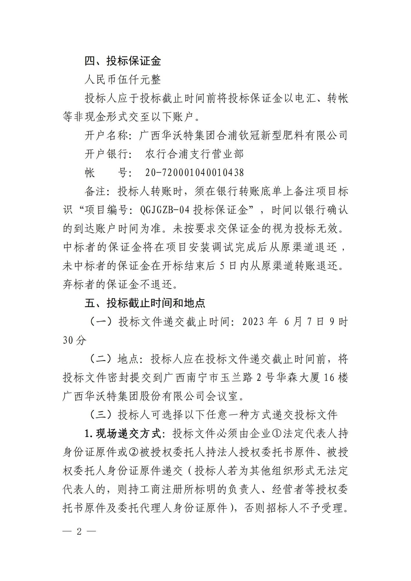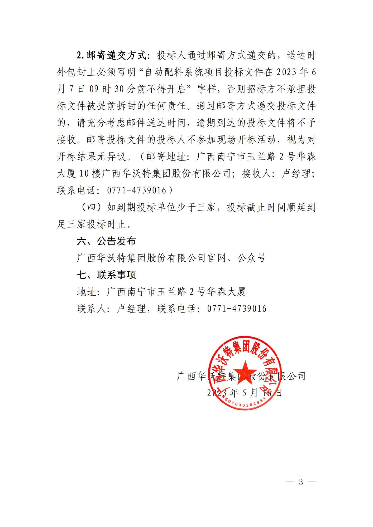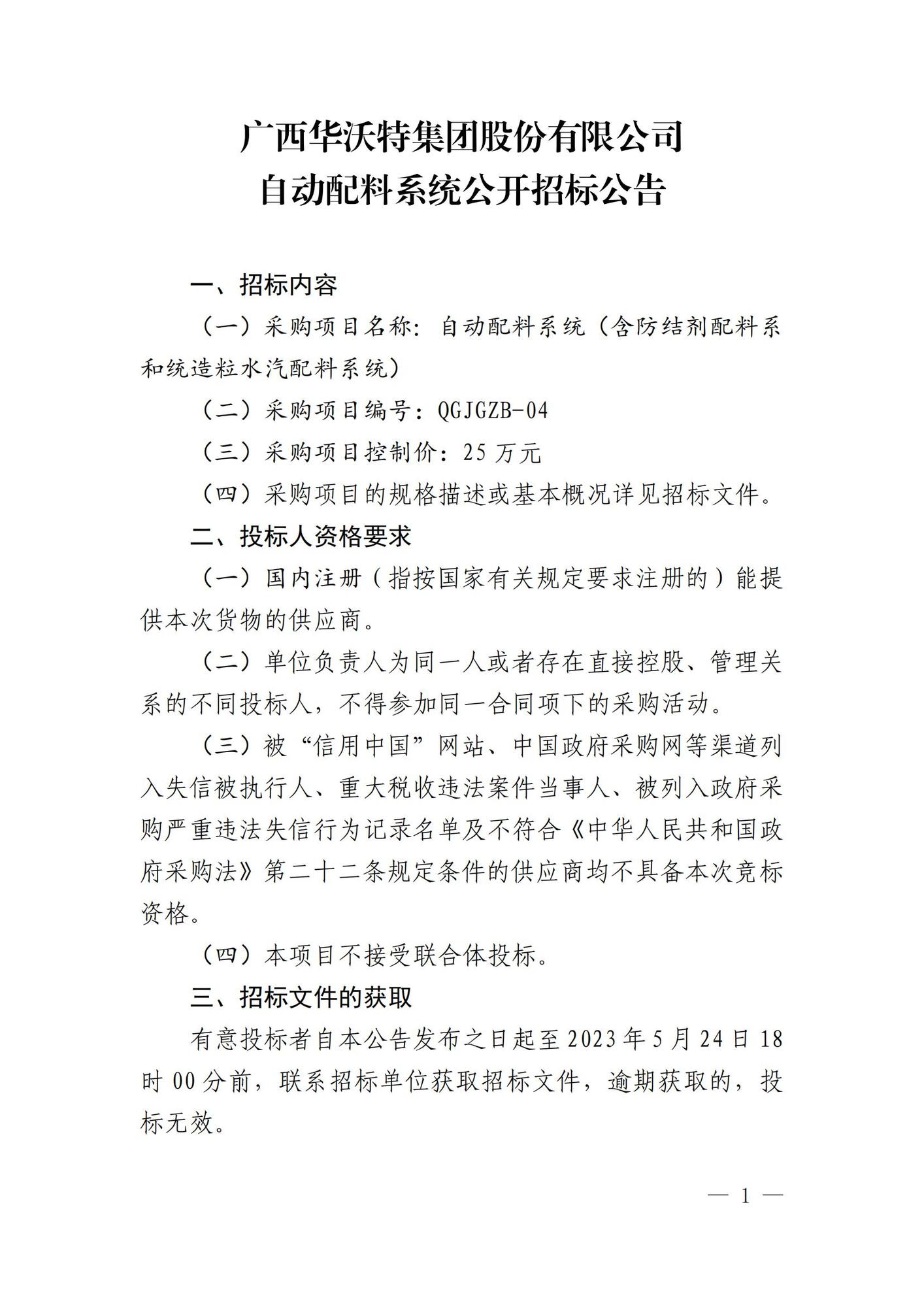 广西华沃特集团股份有限公司自动配料系统公开招标公告