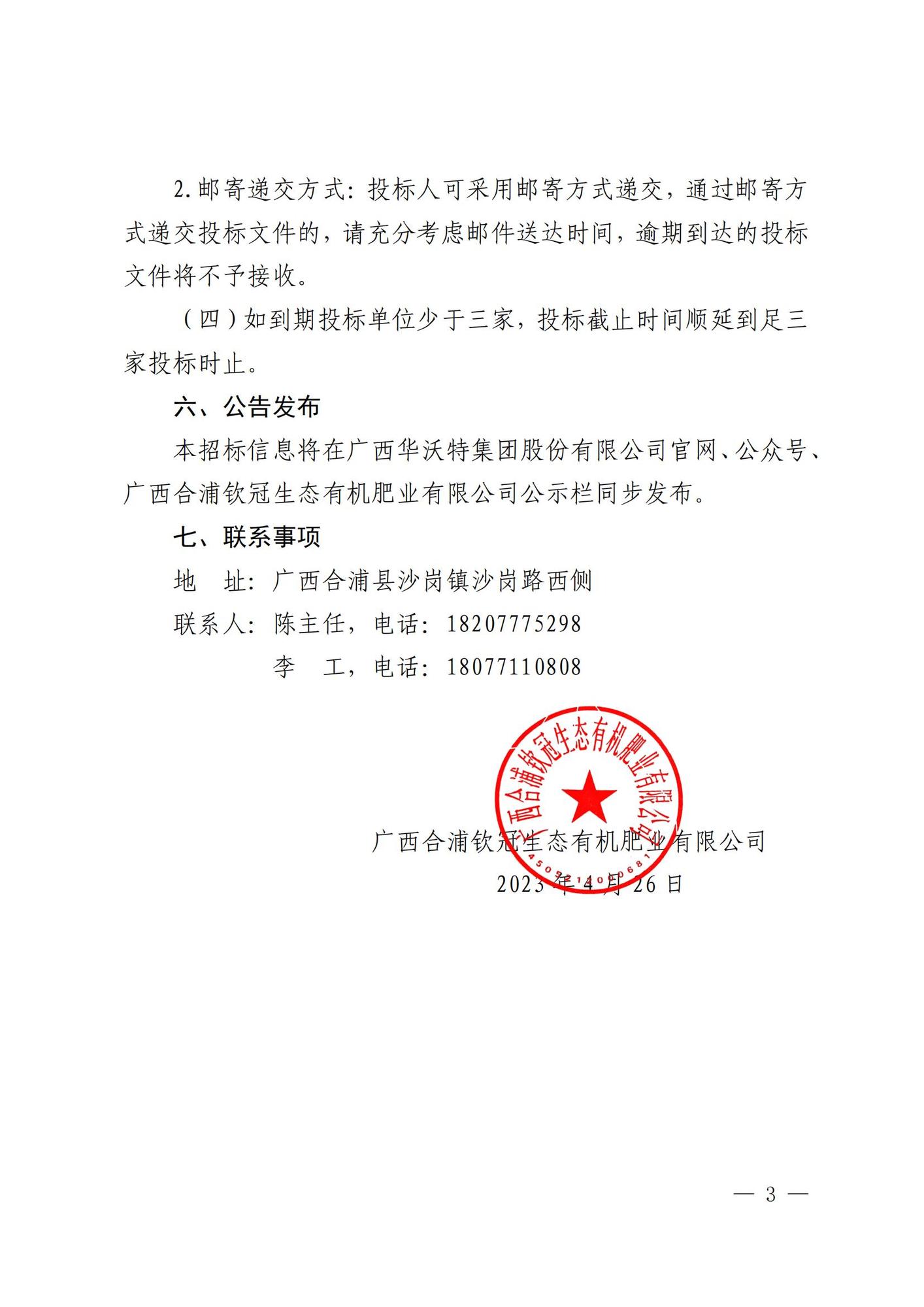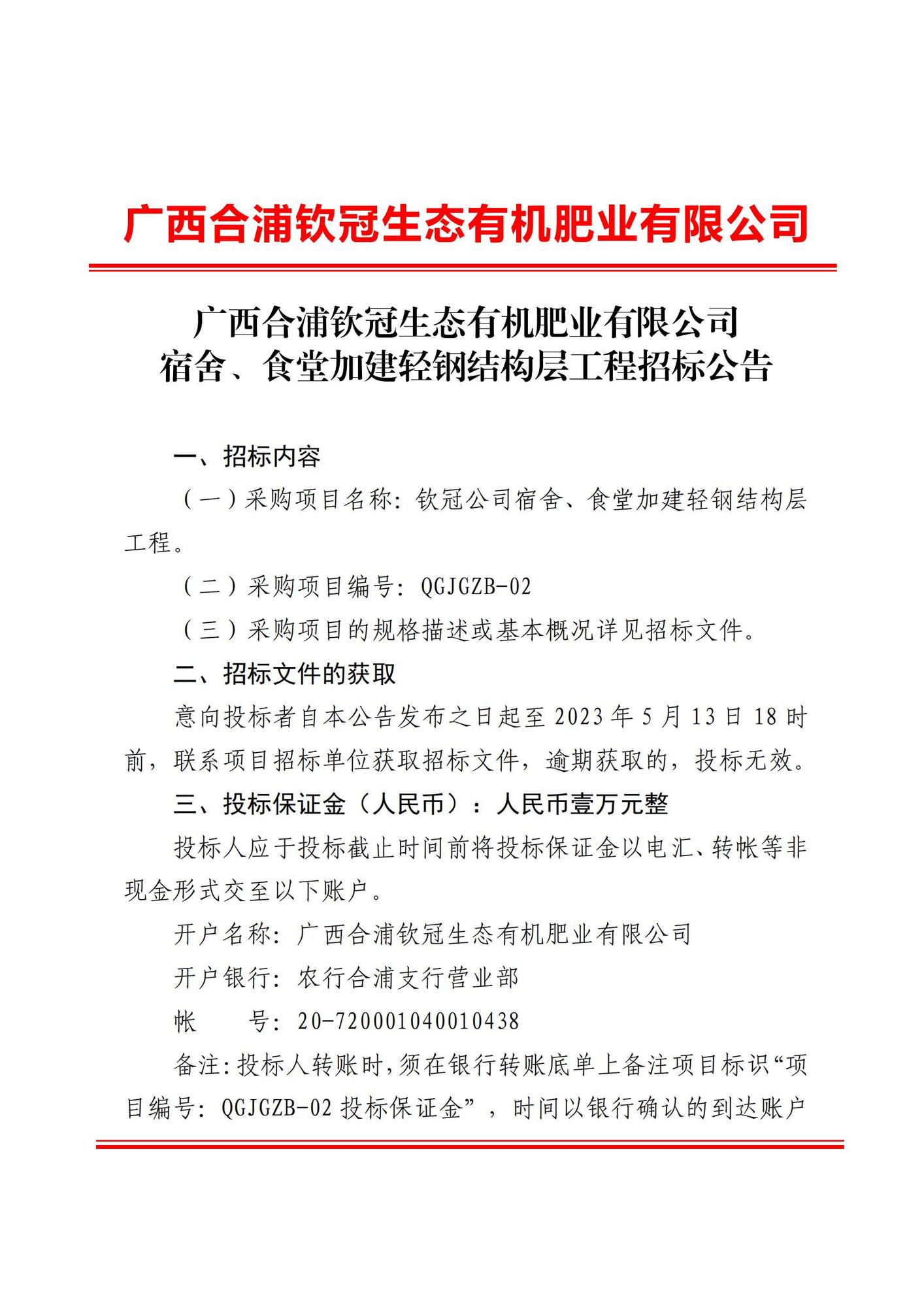 广西合浦钦冠生态有机肥业有限公司宿舍、食堂加建轻钢结构层工程招标公告