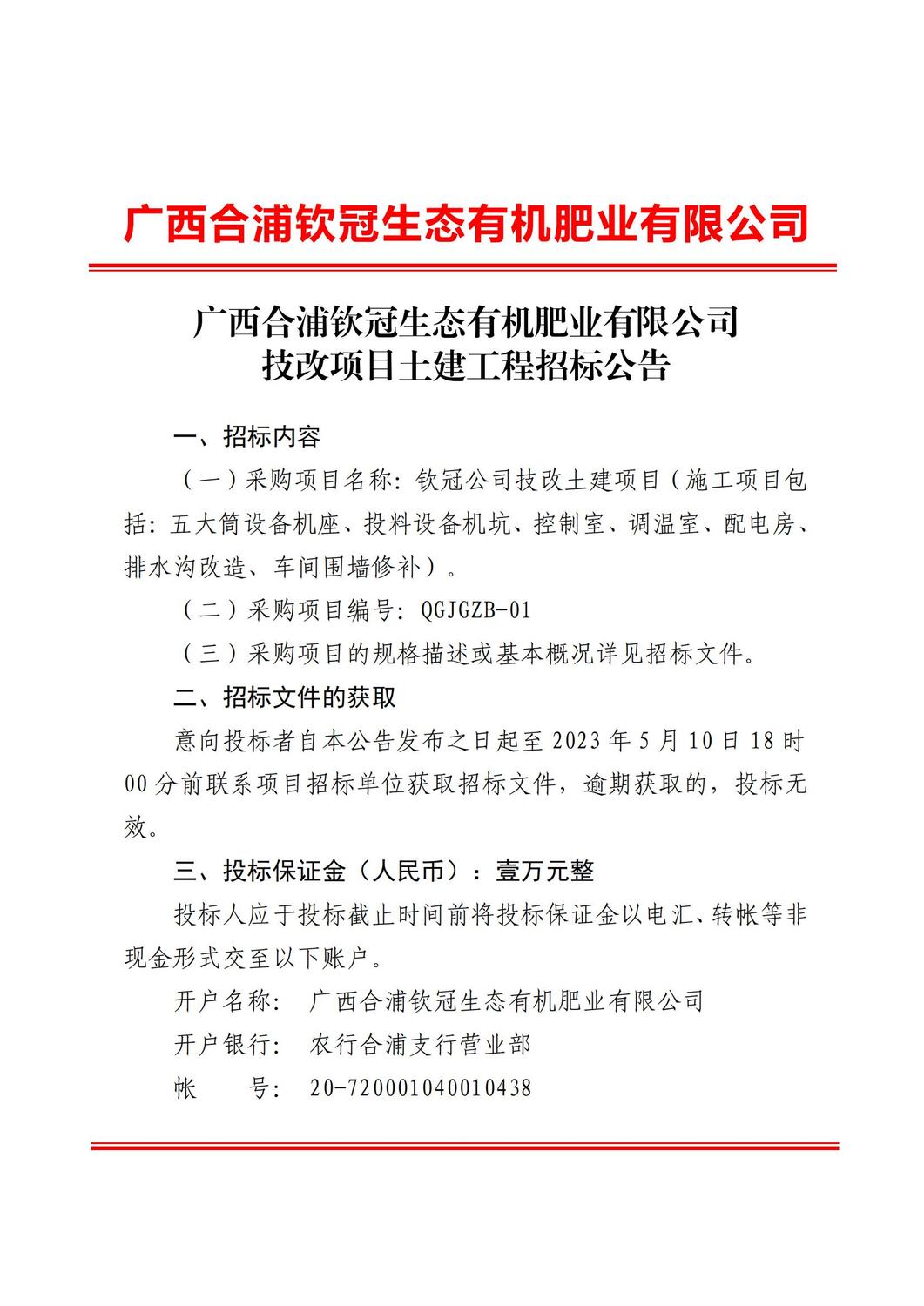 广西合浦钦冠生态有机肥业有限公司技改项目土建工程招标公告