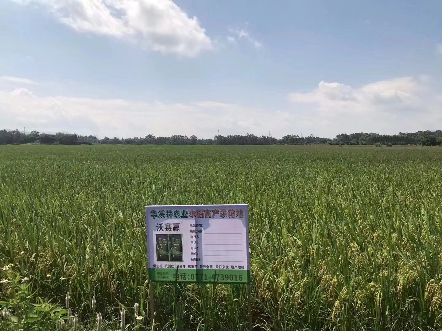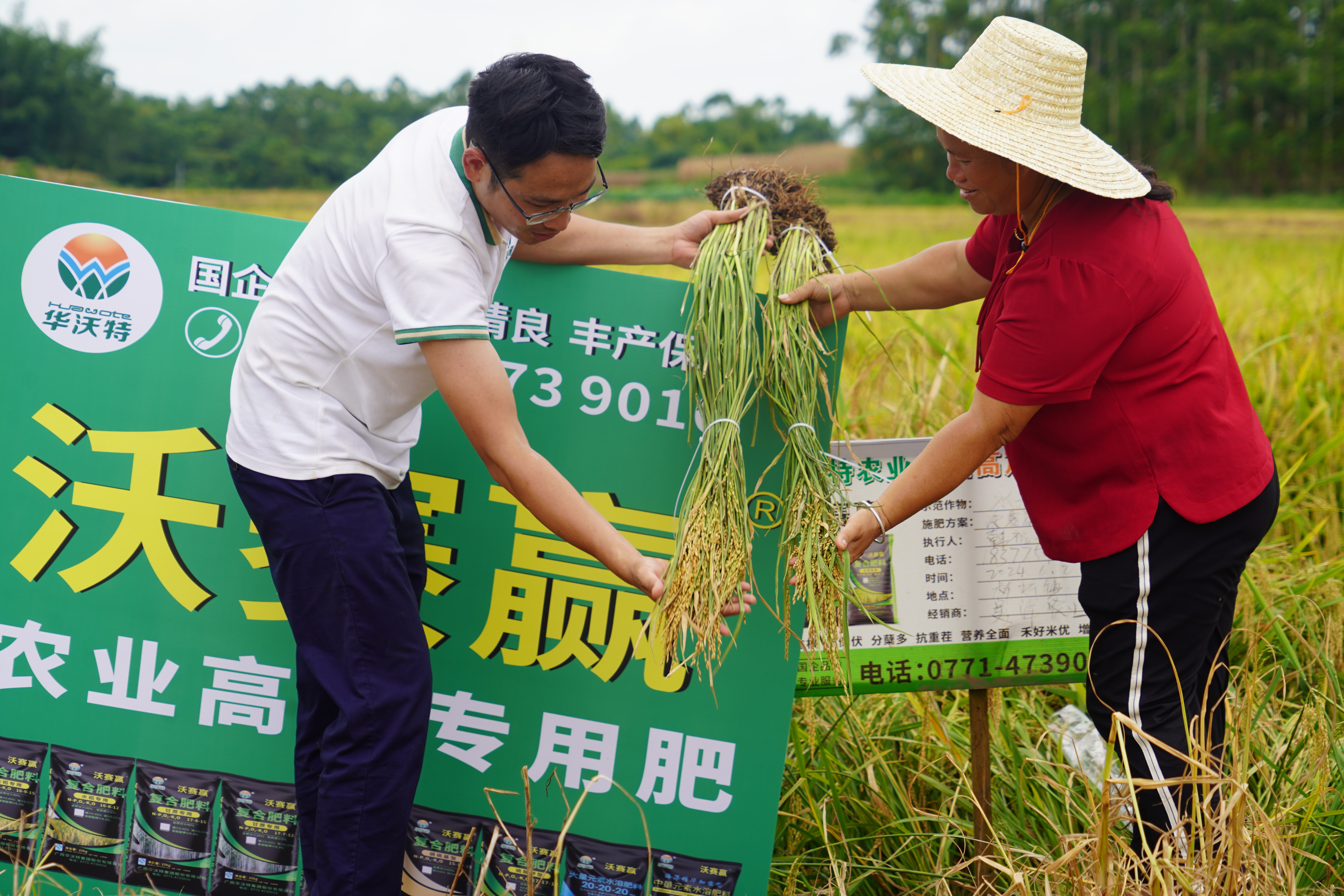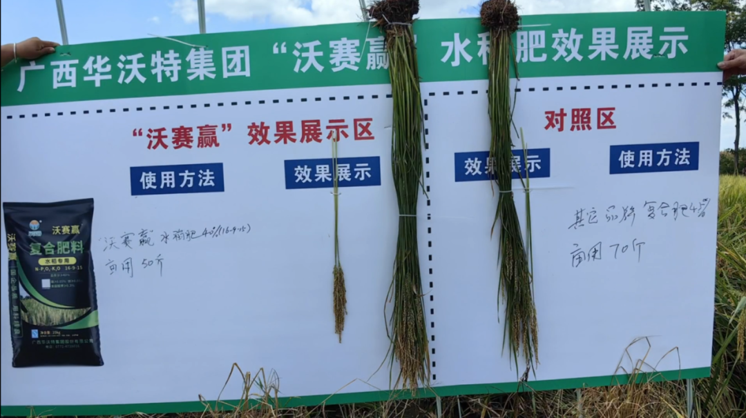 在桥圩镇,使用华沃特“沃赛赢”水稻专用肥的试验田表现尤为突出。试验田占地约1.45亩,在亩施50斤“沃赛赢”水稻专用肥后,稻穗色泽鲜亮,生长态势极佳,稻穗长且饱满,增产效果显著,每亩可收获稻谷约1230斤。相较之下,另一块亩施70斤其他品牌复合肥的对照组田地,约1.57亩,但稻穗生长状况及产量均逊色于使用“沃赛赢”的田地,每亩产量仅约966斤。