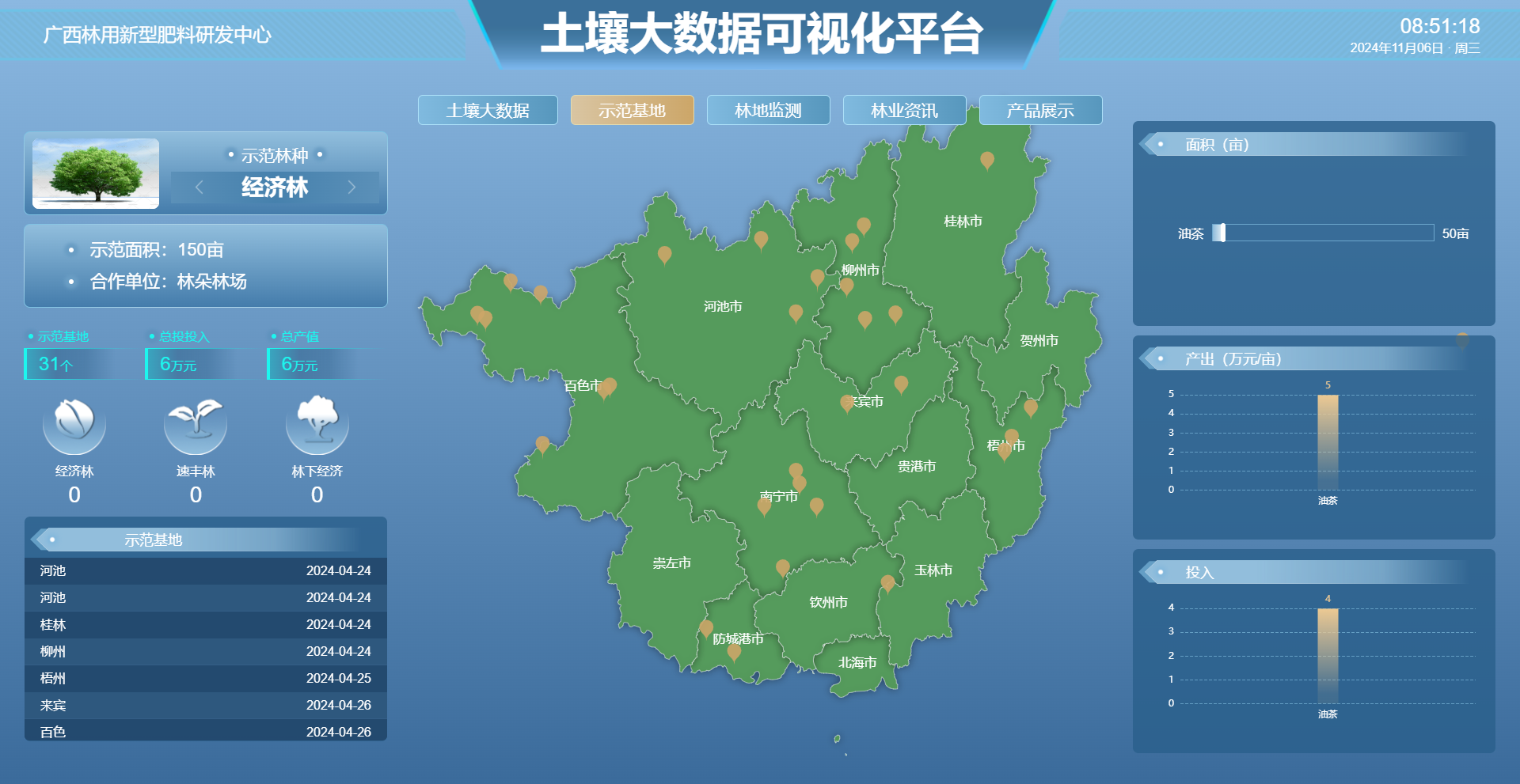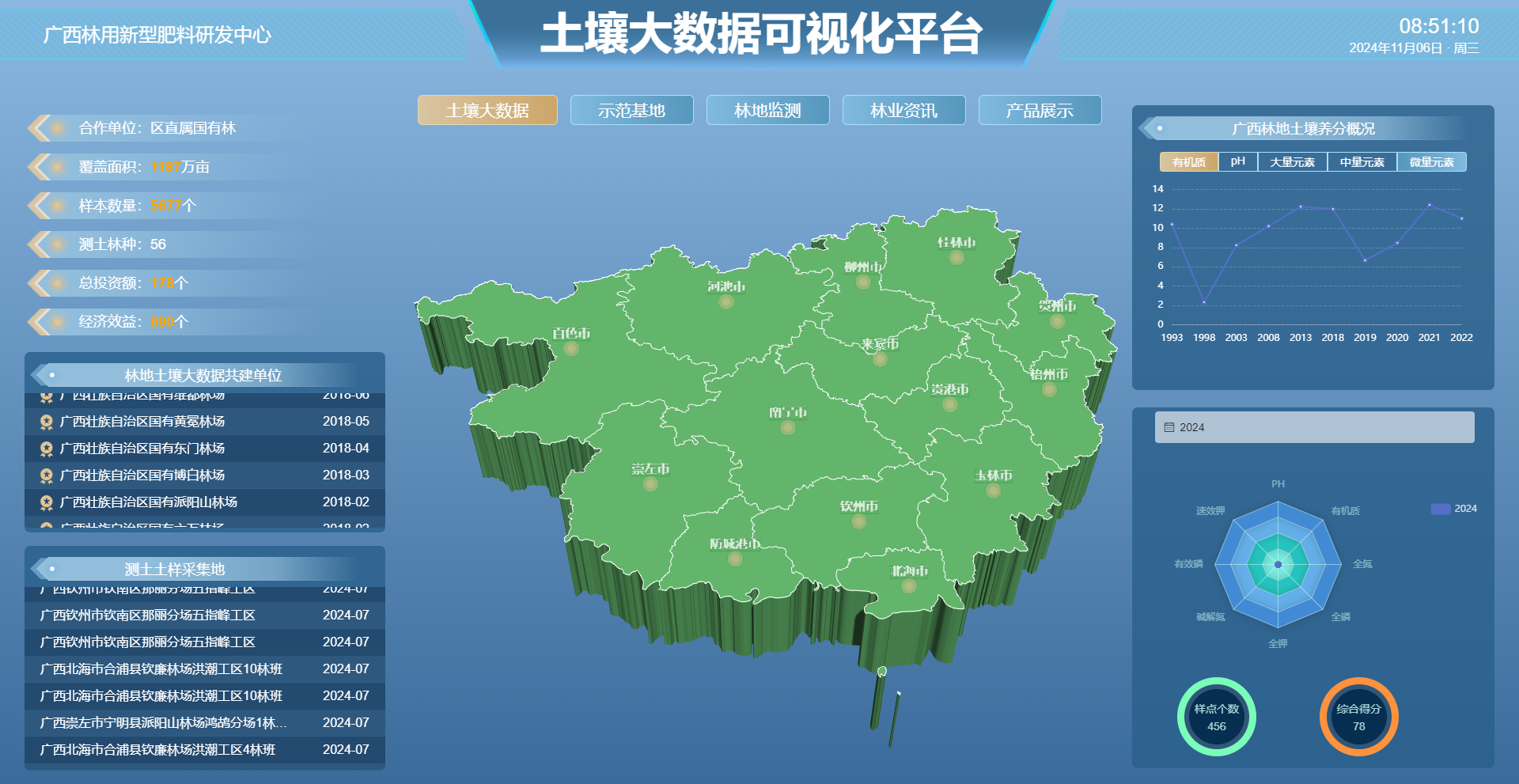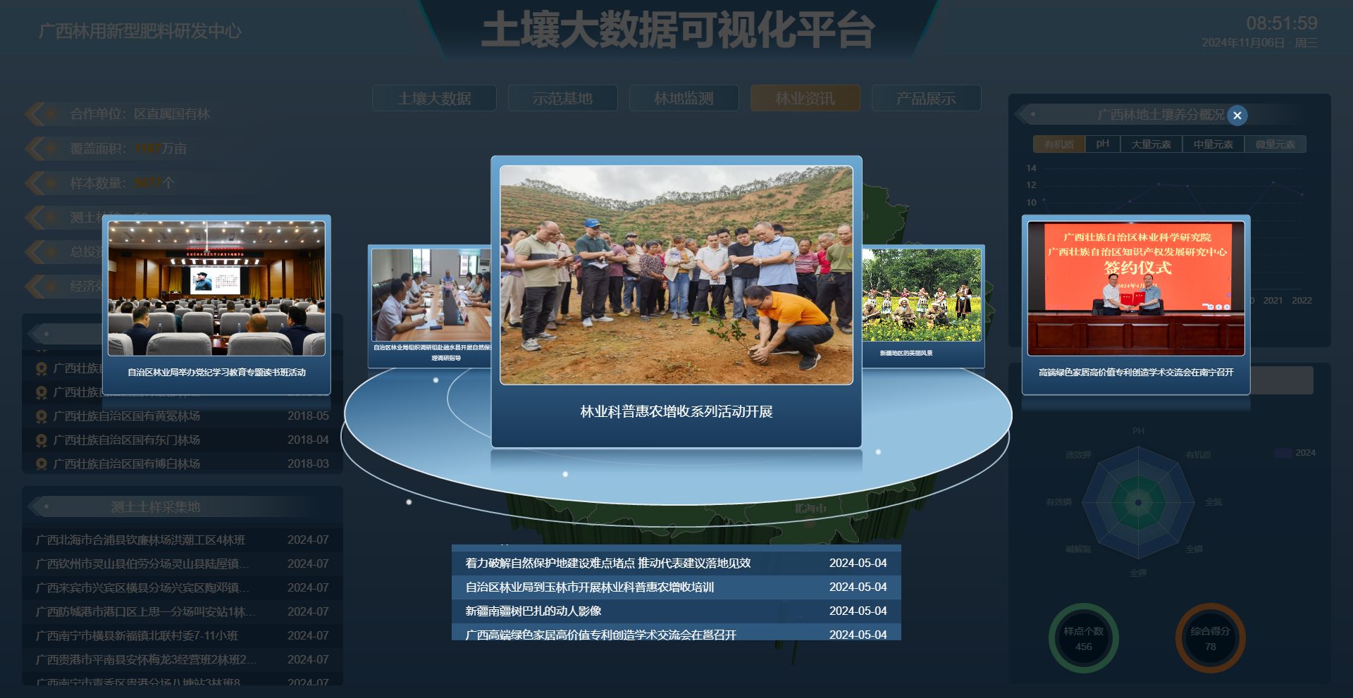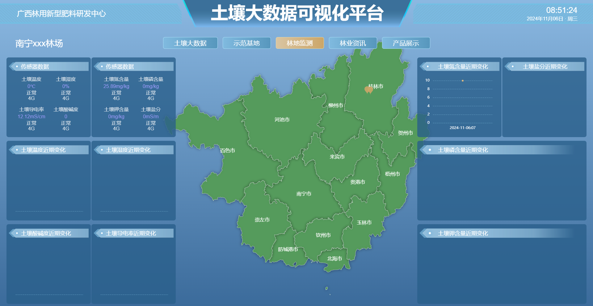 2024年,广西人工林土壤生态大数据平台建设及应用示范项目获得广西重点研发项目立项。该项目以“广西人工林土壤生态大数据平台”为基础,构建“云-边-端林地生态环境监测网络,研制多网融合数据采集智能终端、5G智能网关、土壤养分智能检测装置,研发林生态环境监测、测土配方精准施肥、土壤碳汇功能、预测分析及监测评估等应用,项目总投资1040万元,实施期内新增产值6000万元。